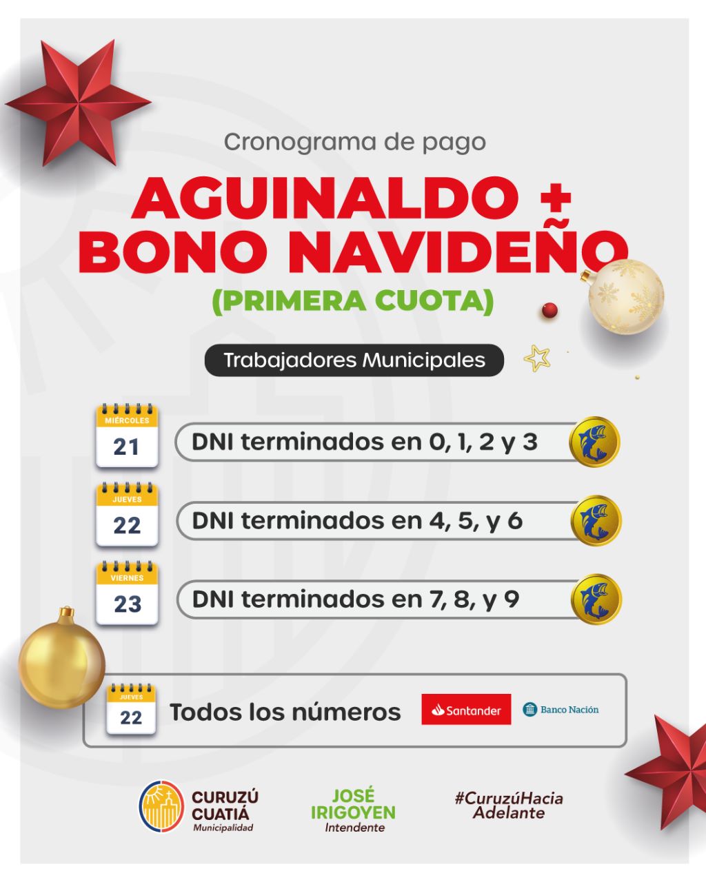 El medio aguinaldo y los 10 mil pesos comienzan a percibir todos los empleados municipales este 21 de diciembre con DNI terminados en 0, 1, 2 y 3. La segunda cuota del bono, o sea los otros 10 mil pesos, se pagarán en enero.