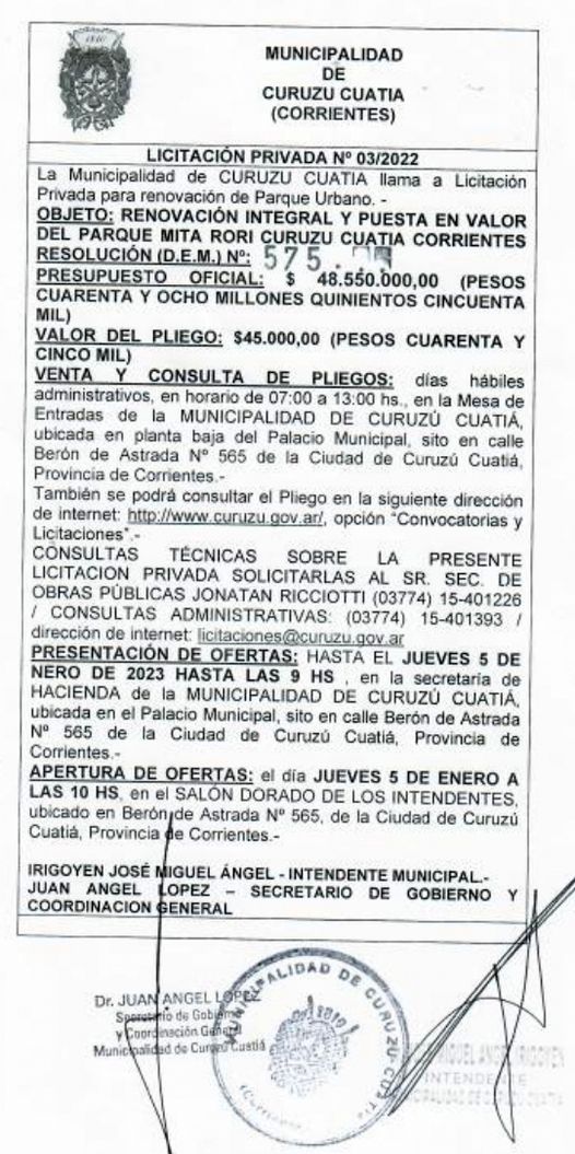 La Municipalidad de Curuzú Cuatiá llama a licitación privada para las obras de renovación integral y puesta en valor del Parque Mitá Rorí.