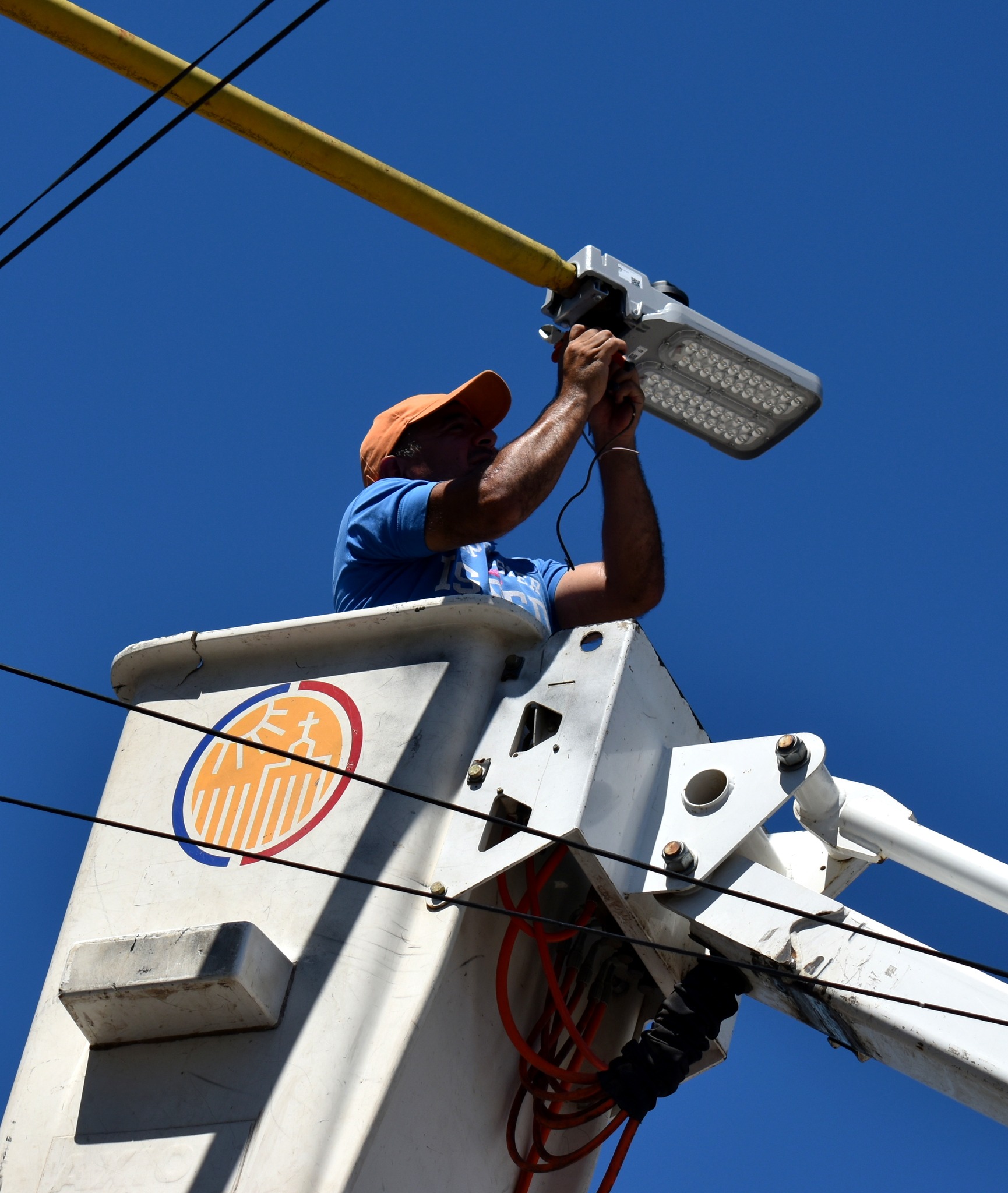 Personal del servicio de electrotecnia de la comuna llevan a cabo trabajos de reemplazo de luminarias convencionales por cabezales LED.