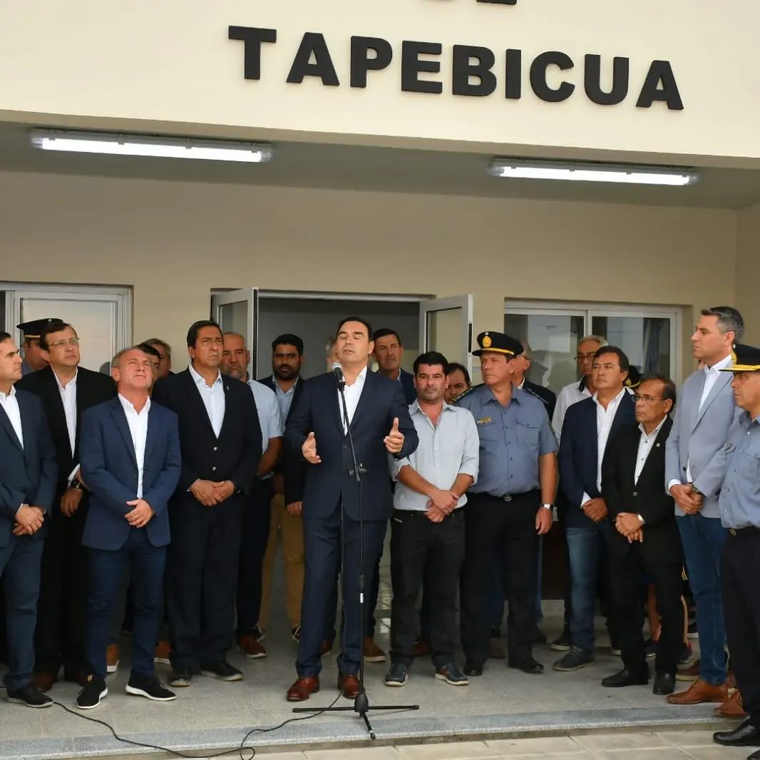 “Acompañe al Gobernador @gustavovaldesok y al Ministro de Seguridad @cachobue2 a la inauguración del nuevo edificio de la comisaria de Tapebicua y Firmas de convenios para el municipio en obras e iluminación. Vamos Corrientes”, escribió en su cuenta oficial de Facebook el legislador curuzucuateño al referirse a la recorrida por Tapebicuá.
