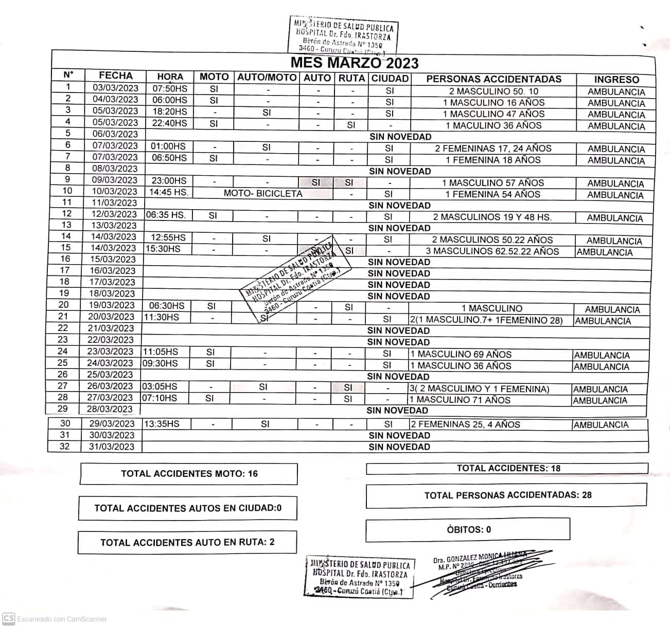 En total se registraron 18 accidentes, de los cuales 16 de ellos fueron protagonizados por motos, mientras que dos correspondieron a automóviles en ruta, en tanto que no ingresaron heridos por accidentes de autos en la ciudad.