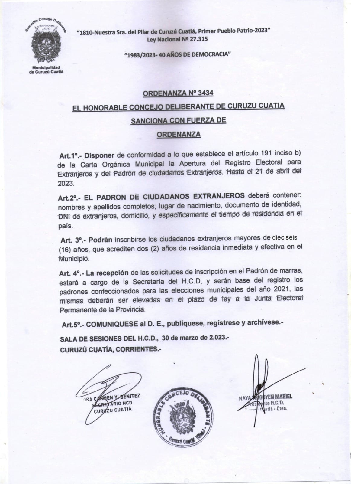 El Honorable Concejo Deliberante de Curuzú Cuatiá comunica que a partir de este lunes 3 y hasta el 21 de abril del corriente año, se encuentra abierto el Padrón Electoral Municipal de ciudadanos Extranjeros de acuerdo a lo que establece el ART. 191 Inc. B) de la Carta Orgánica Municipal.