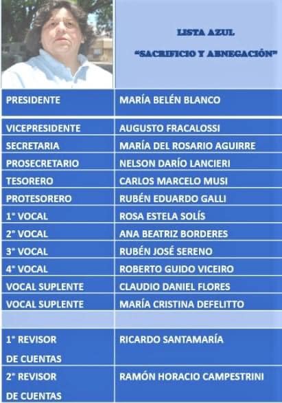 Se trata de la Lista Azul "Sacrificio y Abnegación" la que es encabezada por la Doctora Belén Blanco quien busca su reelección en la institución.