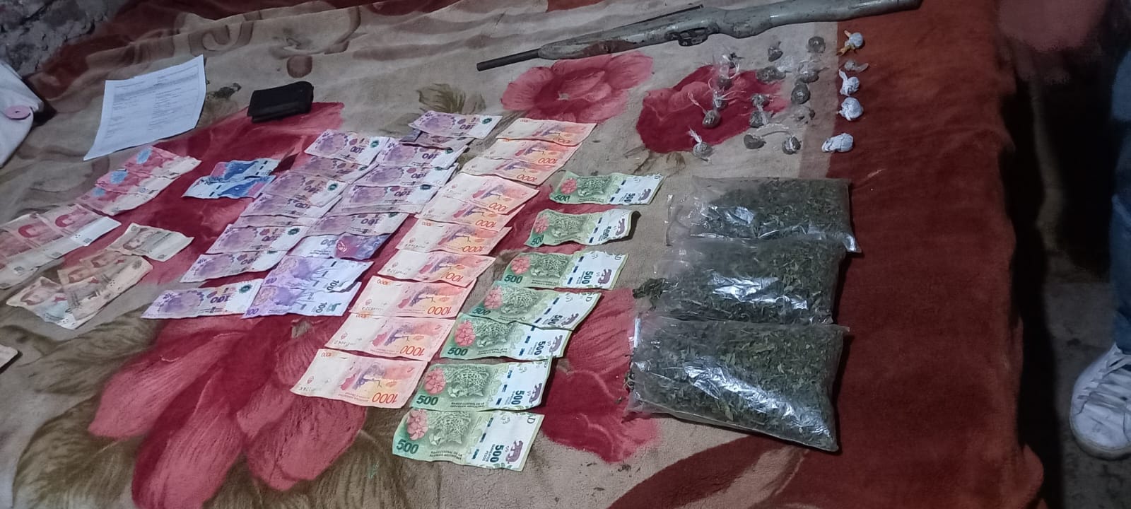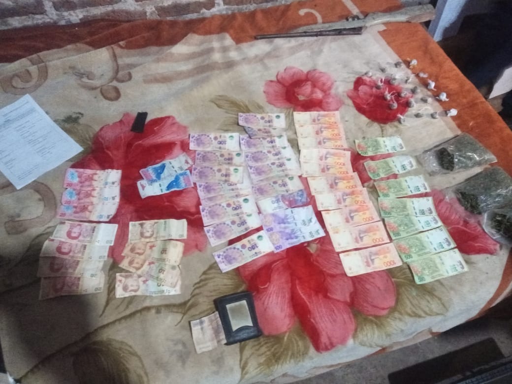 Al momento de realizar el allanamiento personal policial al ingresar a la vivienda se percató de tres bultos posiblemente marihuana y envoltorios (Bochitas) presumiblemente listo para la comercialización, también se incautó una gran suma de dinero en efectivo que sería de la venta de estupefacientes. Además se secuestró animales silvestres protegidos, armas de fuego y una motocicleta.
