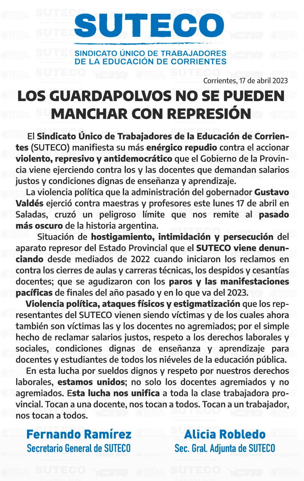 Bajo el titulo “Los guardapolvos no se pueden manchar con represión”, el gremio docente que conduce el curuzucuateño Fernando Ramírez se expresó respecto a una situación ocurrida en Saladas.