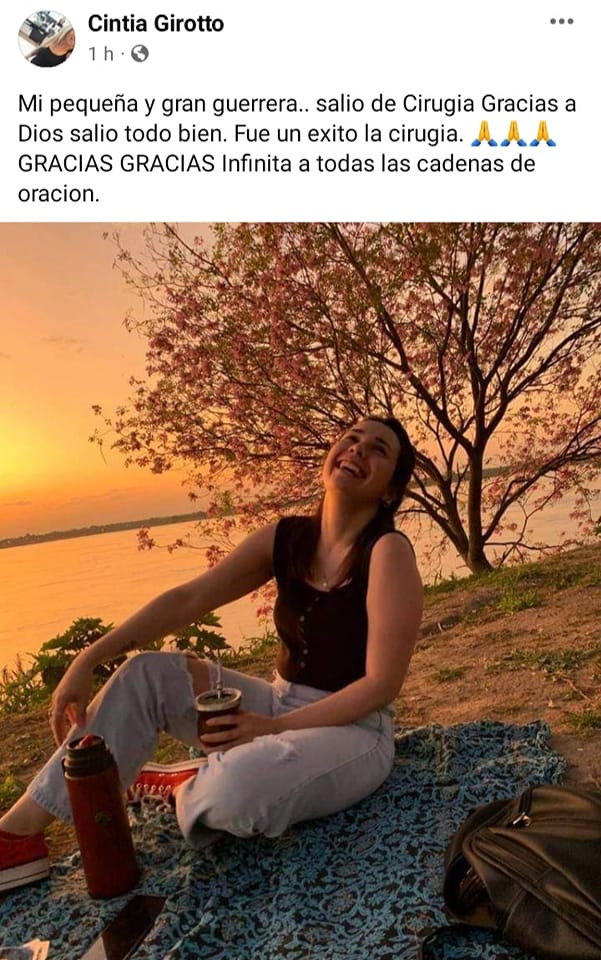 En su cuenta de Facebook, Cintia hizo un posteo al respecto: “Mi pequeña y gran guerrera.. salio de Cirugia Gracias a Dios salio todo bien. Fue un exito la cirugia GRACIAS GRACIAS Infinita a todas las cadenas de oración”, escribió.
