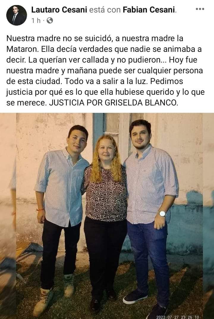 A través de su cuenta de Facebook, Lautaro Cesani, hijo de Griselda Blanco, la comunicadora local que fue encontrada sin vida en su casa, realizó un fuerte descargo.