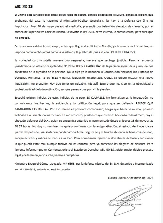 Escuché existen indicios de esto, indicios de lo otro, ES CULPABLE. No formalizamos la imputación, no comunicamos los hechos, la evidencia y la calificación legal, para que se defienda. PARECE QUE CAMBIARON LAS REGLAS. Por eso realizo el presente comunicado, tengo que hacer lo mismo, primero defiendo a mi cliente en los medios. No me presenté, perdón, es que estamos haciendo todo al revés; soy el abogado defensor del D.H., quien se encuentra detenido e incomunicado desde el jueves 25 de mayo a las 20:57 horas. No doy su nombre, no quiero continuar con la estigmatización, el estado de inocencia se pierde después de una sentencia condenatoria firme, seguro se justificarán diciendo si tiene cola de león, cuerpo de león, y cabeza de león, es un león. Pero permítanme ejercer su derecho de defensa y cuestionar lo que pueda estar mal, aunque todavía no las conozca, pero ya presencie los alegatos de clausura. Pero lamento informar que en Corrientes existe el Estado de Derecho, ASÍ, NO ES. Juicio previo, debido proceso legal y defensa en juicio están, vamos a cumplirlas.