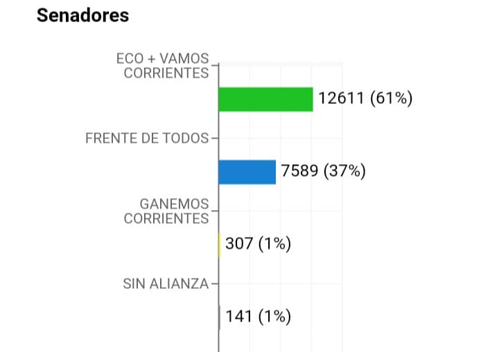 De esta manera los resultados provisorios, tras el 100% de mesas escrutadas, confirman que fueron electos los siguientes candidatos: NICOLAS ALVAREZ, MARIEL NAYA YRIGOYEN, PEDRO GONZALEZ y MARISA ACUÑA POR ECO + VAMOS CORRIENTES y NORMA CASTILLO y CONSTANTINO TSOTSON por el Frente de Todos Curuzú Cuatiá.