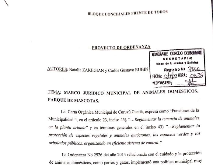 El Bloque del Frente de Todos en el Honorable Concejo Deliberante de Curuzu Cuatiá, conformado por los concejales Carlos Rubín y Natalia Zakegian, presentó un Proyecto de Ordenanza para la creación de un Parque de Mascotas y Regulación de Animales Domésticos.