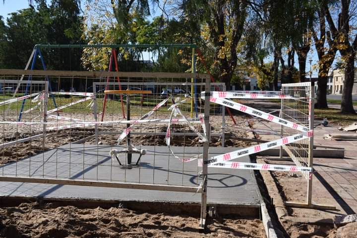 En la plaza General San Martín se están instalando un mangrullo de dos torres con 1 techo-toboganes cerrados pórtico y puente, más una calesita inclusiva apta para niños en silla de ruedas.