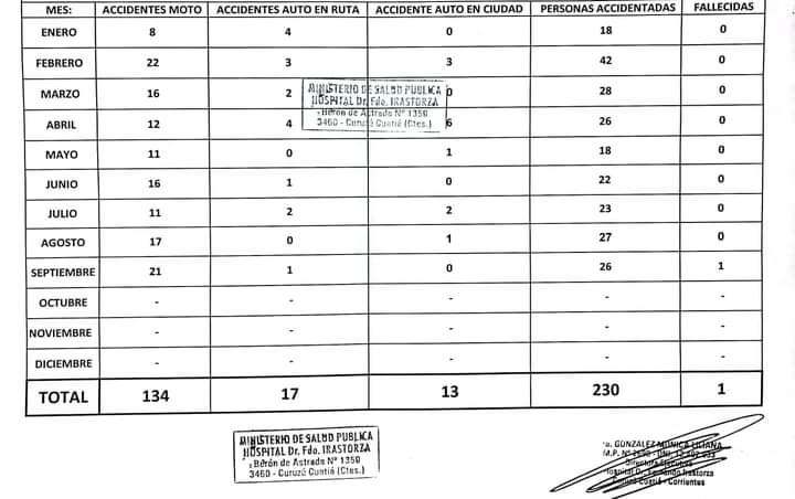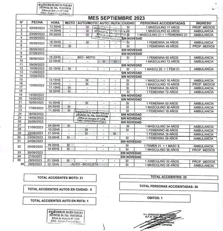 El Hospital Fernando Irastorza emitió un informe estadístico sobre el ingreso de personas al servicio de guardia para ser atendidas por accidente de tránsito durante el noveno mes del año.