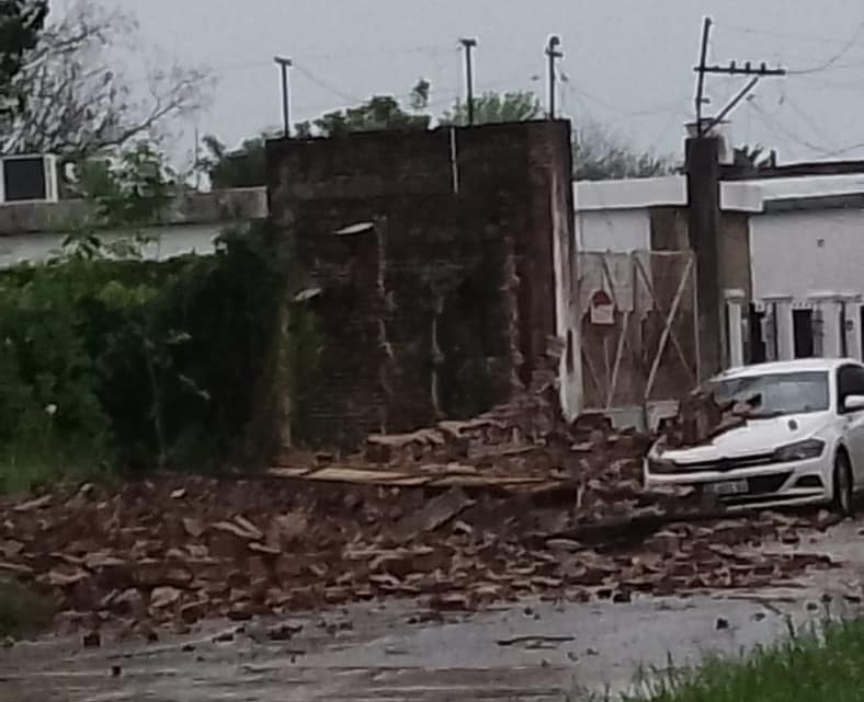 Uno de los daños más importantes se registró en San Martín al 500, con el derrumbe de un muro en el taller de la comparsa Antifaz, parte de la mampostería cayó sobre al menos dos automòviles que se encontraban estacionados.