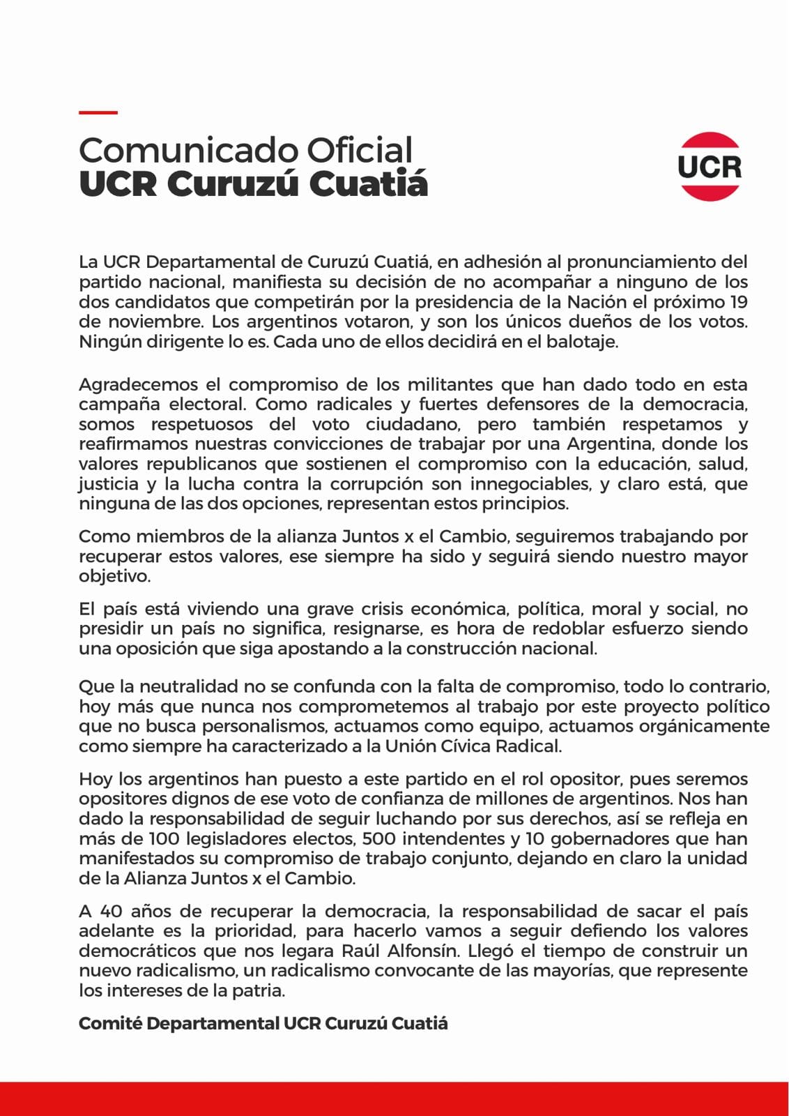 El Comité Departamental, presidido por la Senadora Provincial Verónica Espíndola, s expresó mediante un comunicado oficial dónde fijó posición tras los resultados de las elecciones presidenciales del pasado domingo.