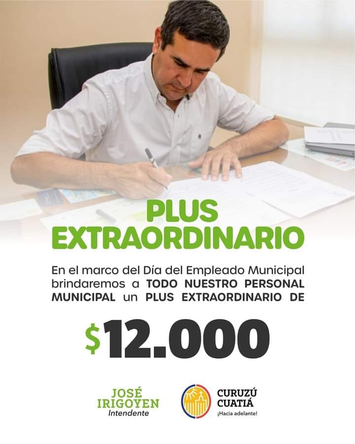El Intendente Municipal José Irigoyen anunció este martes el pago de un plus extraordinario de 12 mil pesos para todos los empleados municipales curuzucuateños que este 8 de noviembre festejarán el día del empleado municipal.