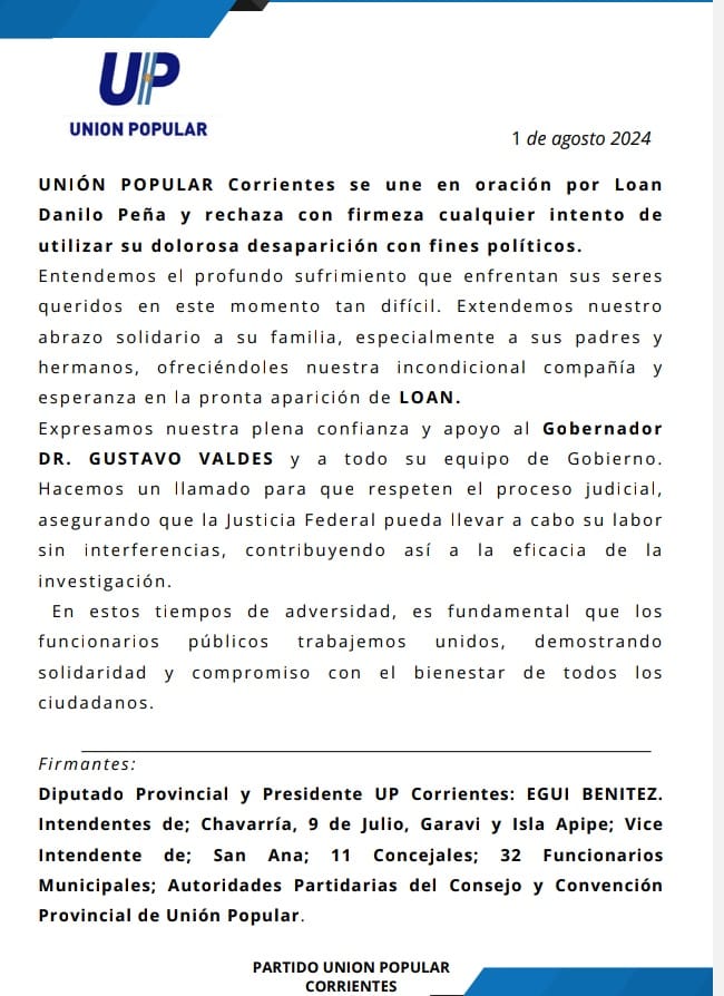 Unión Popular pidió por la aparición de Loan, rechazo la utilización política del caso y respaldó a Valdés