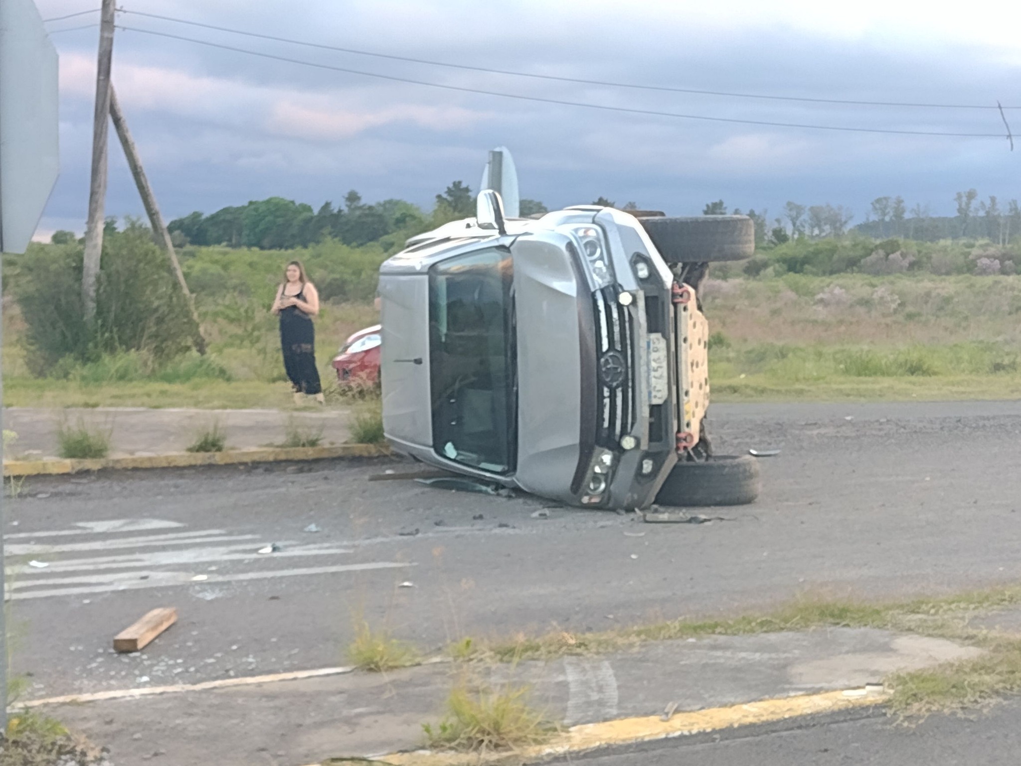 El tremendo impacto dejó a la camioneta volcada en el inicio de la ruta 126 y al vehículo con su parte de adelante destrozada y haciéndolo girar tras el trompo hacia la dirección de donde venía.