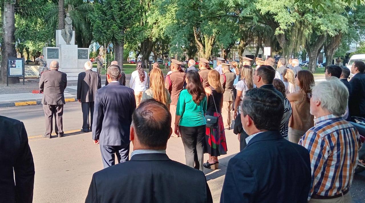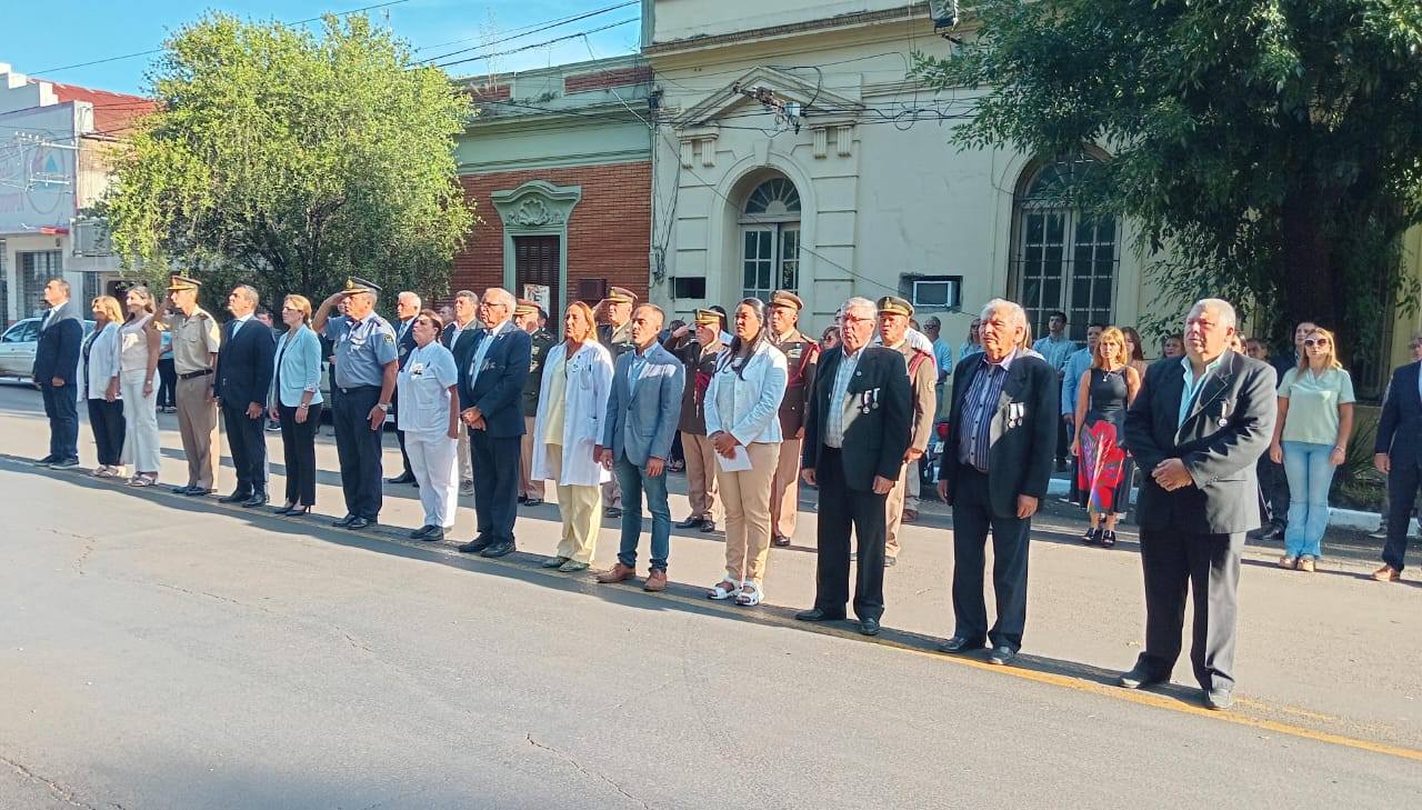 Las autoridades se concentraron poco antes de las 8 de la mañana en el Salón Dorado del Palacio Municipal y desde allí se trasladaron hasta el Mástil Mayor donde los Veteranos de Guerra de Malvinas, bajo los acordes de la marcha regular ejecutado por el trompeta Sargento Primero Antonio Alegre perteneciente a la Banda Militar del Batallón de Comunicaciones 121, izaron la Bandera Nacional.