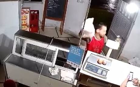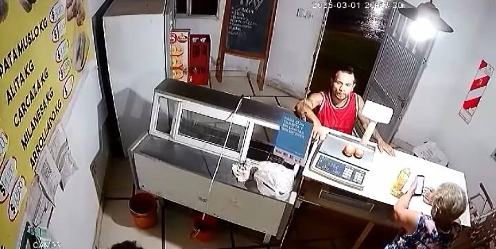 Allí se observa al muchacho ingresar al local, haciéndose pasar por un cliente, y pedir algunos comestibles, como aceite y algunos cortes de pollo.