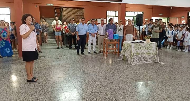 El acto se desarrolló poco después de las 13:30 horas y en la oportunidad se entonaron las estrofas del Himno Nacional y luego hizo uso de la palabra la Directora del establecimiento, Cristina Díaz.