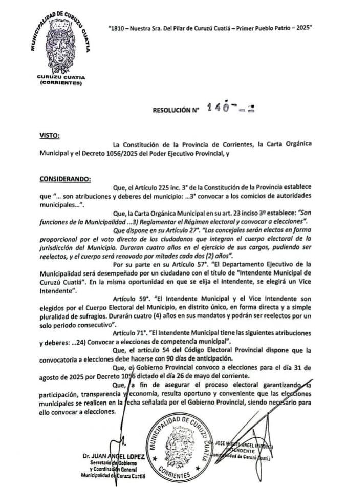 De esta manera Curuzú Cuatiá elegirá Intendente y Viceintendente, así como cinco Concejales, el domingo 31 de agosto de 2025; la resolución lleva la firma del Intendente Municipal Dr. José Irigoyen y el Secretario de Gobierno y Coordinación General Dr. Juan Ángel López.