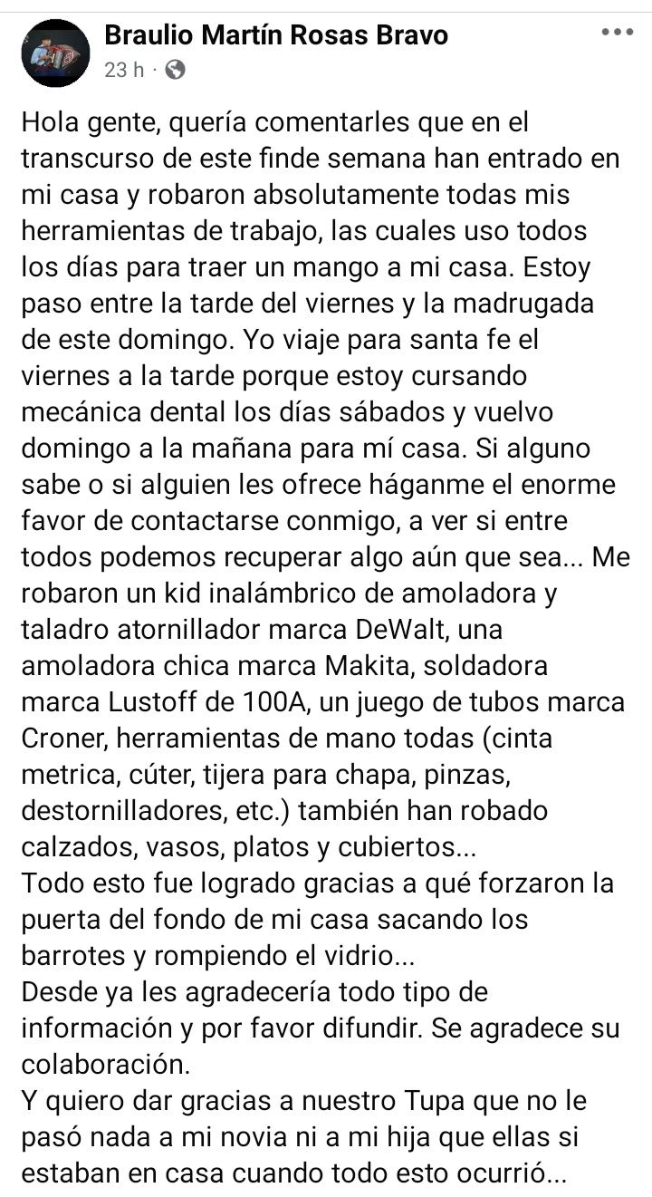 “Me robaron un kid inalámbrico de amoladora y taladro atornillador marca DeWalt, una amoladora chica marca Makita, soldadora marca Lustoff de 100A, un juego de tubos marca Croner, herramientas de mano todas (cinta metrica, cúter, tijera para chapa, pinzas, destornilladores, etc.) también han robado calzados, vasos, platos y cubiertos”, escribió en su muro de la popular red social.