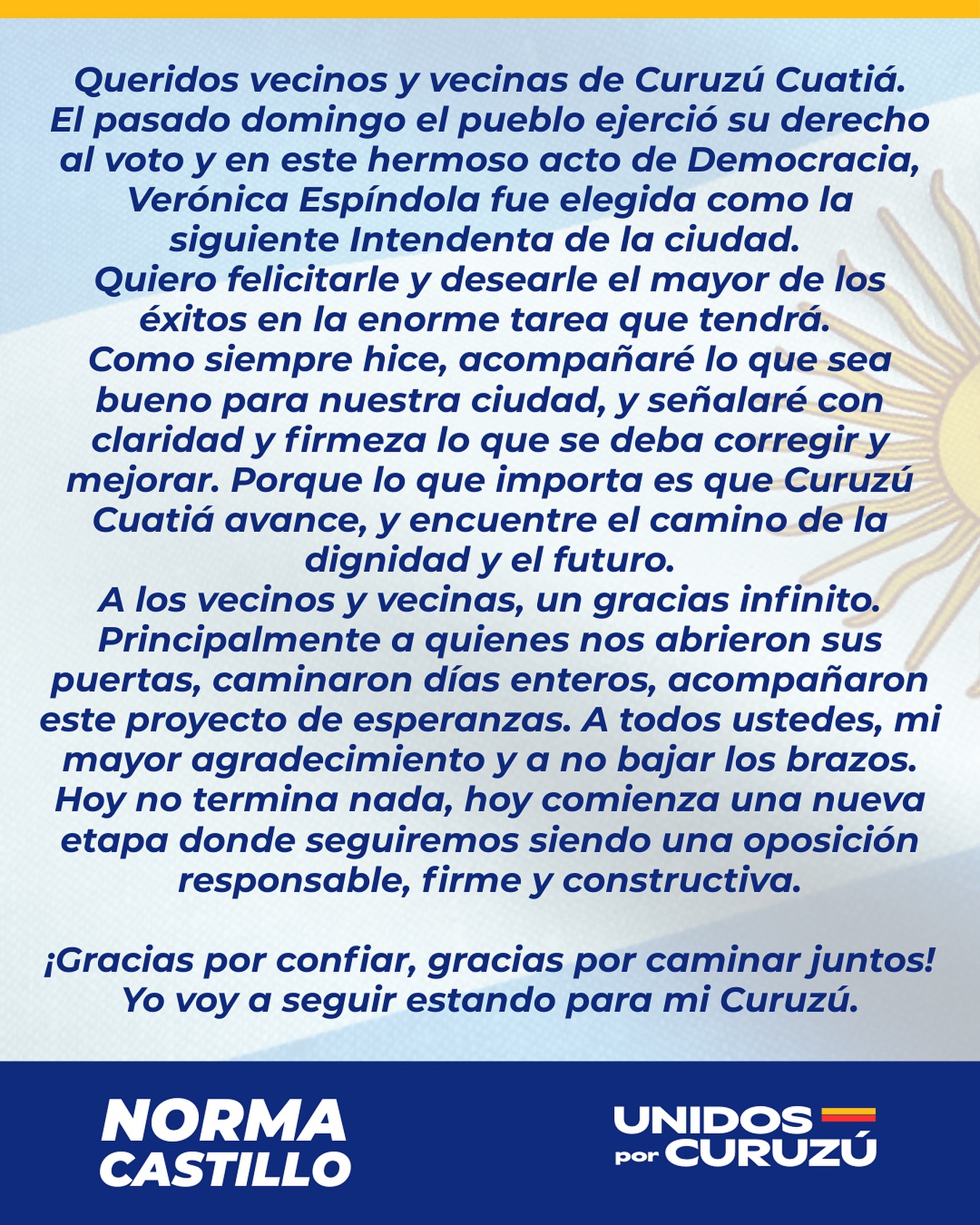Mediante un comunicado publicado en su cuenta oficial de Facebook, la candidata a Intendente de Unidos por Curuzú se expresó tras el acto eleccionario del domingo que la dejó en el segundo lugar con mas de siete mil votos.