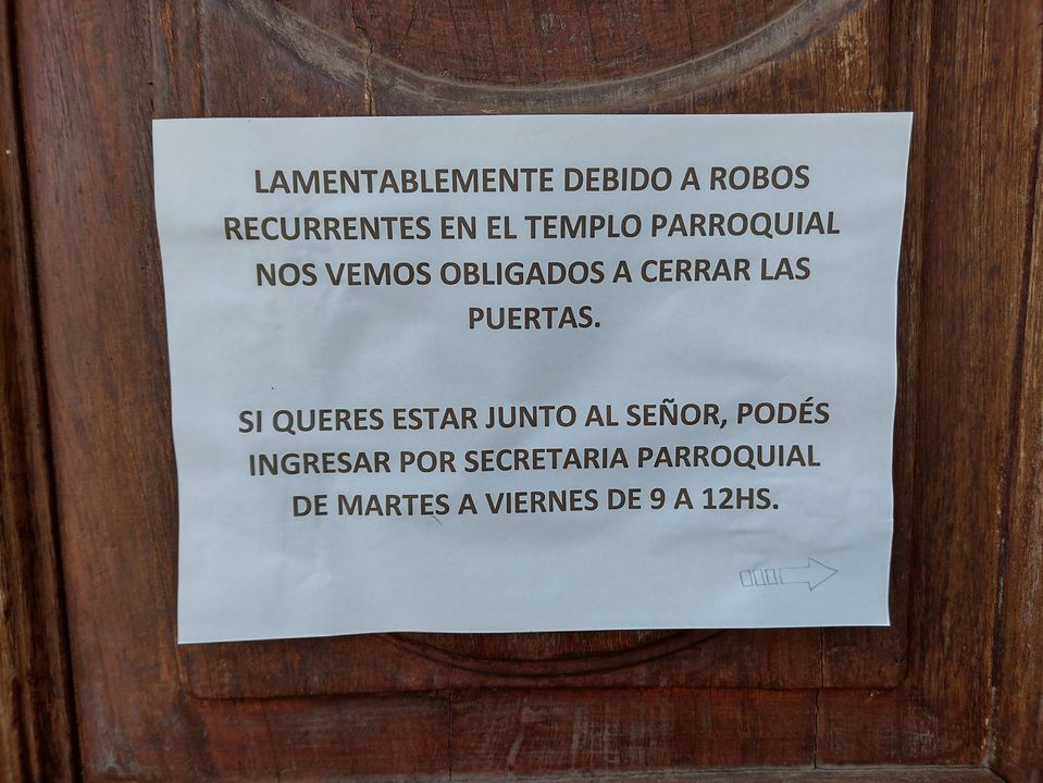 “Lamentablemente debido a robos recurrentes en el templo parroquial nos vemos obligados a cerrar las puertas. Si querés estar junto al Señor, podes ingresar por Secretaria Parroquial de martes a viernes de 9 a 12 horas”, señala el cartel que fue colocado en la puerta principal de acceso a la Parroquia.