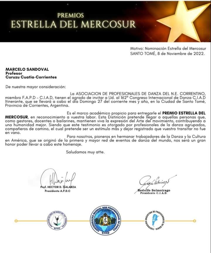 El reconocido bailarín y coreógrafo curuzucuateño será distinguido con este galardón el próximo domingo 27 de noviembre en la Ciudad de Santo Tomé, en el marco del 162º Congreso Internacional de la Danza.