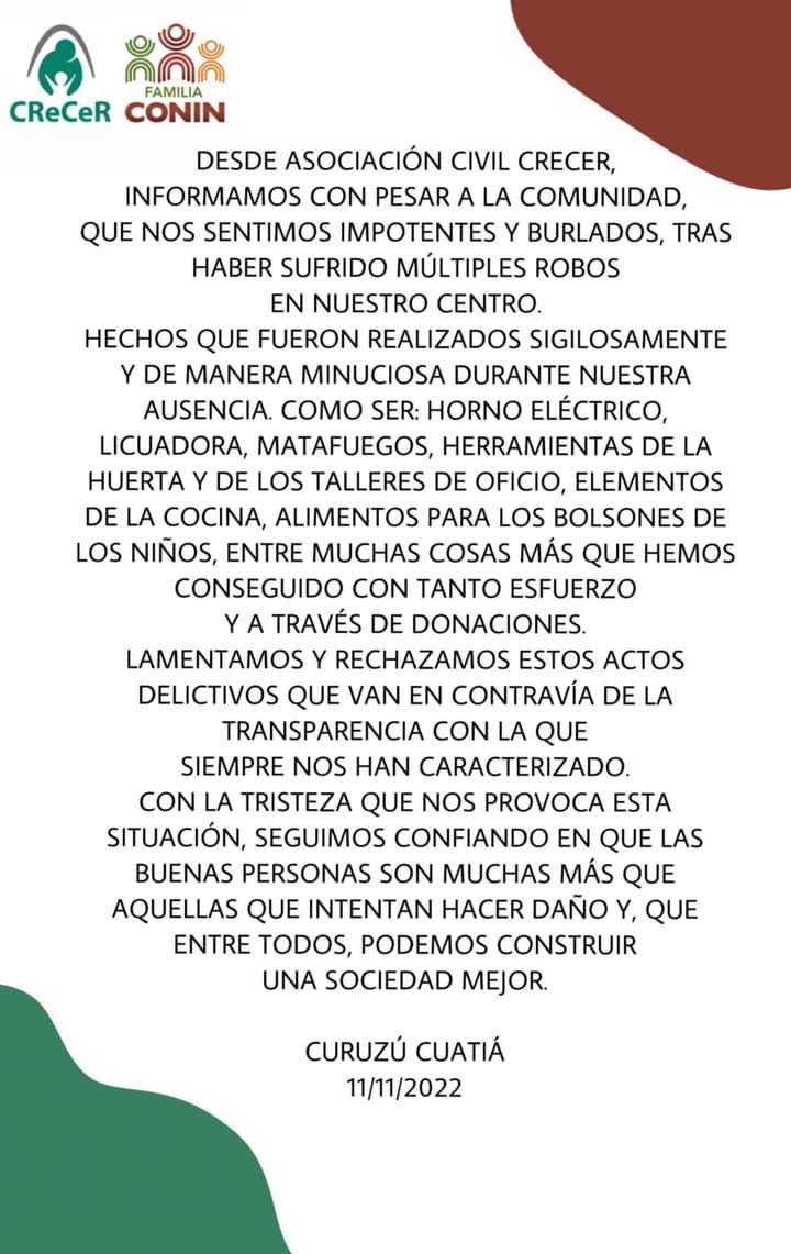 Mediante su cuenta oficial en Facebook, la Asociación CRECER, dependiente de la reconocida Fundación CONIN, denunció que ha sido víctima de múltiples robos ocurridos en su centro ubicado en un predio del ejército.