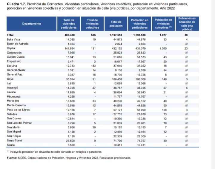En el informe dado a conocer con los datos a nivel país, quedaron publicados los números correspondientes al Departamento de Curuzú Cuatiá, en la que, además de nuestra ciudad y todo su ejido rural, están incluidas las localidades de Perugorria y Cazadores Correntinos.