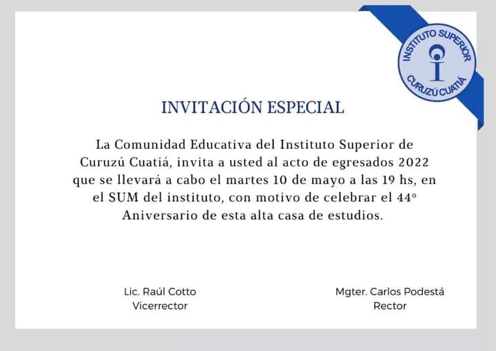 El Instituto Superior de Curuzú Cuatiá comunica que, como todos los años, realizará su Acto Académico, oportunidad en que la casa de estudios también celebrara sus 44 años de fundación.