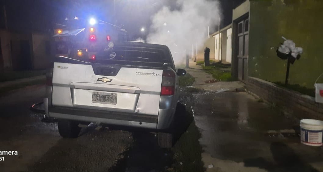 Se trata de una camioneta Chevrolet, color gris, la que comenzó a arder alrededor de las 3 de la mañana. Intentan establecer las causales del inicio del foco ígneo, no descartando que haya sido intencional por el testimonio del sereno.
