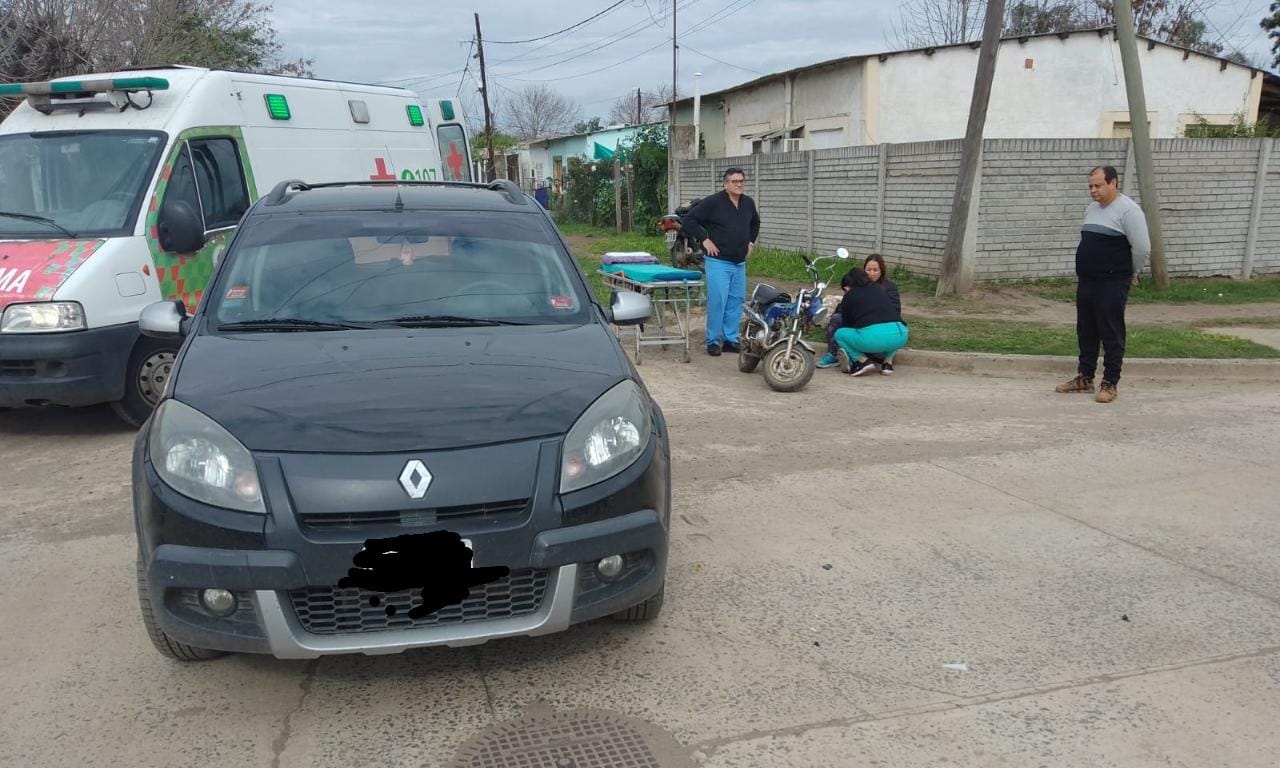Un automóvil Renault Sandero y una moto de 70 centímetros cúbicos protagonizaron en horas de la mañana del martes un accidente en la intersección de las calles Larrea y Soler, en el Barrio 100 Viviendas de nuestra ciudad.