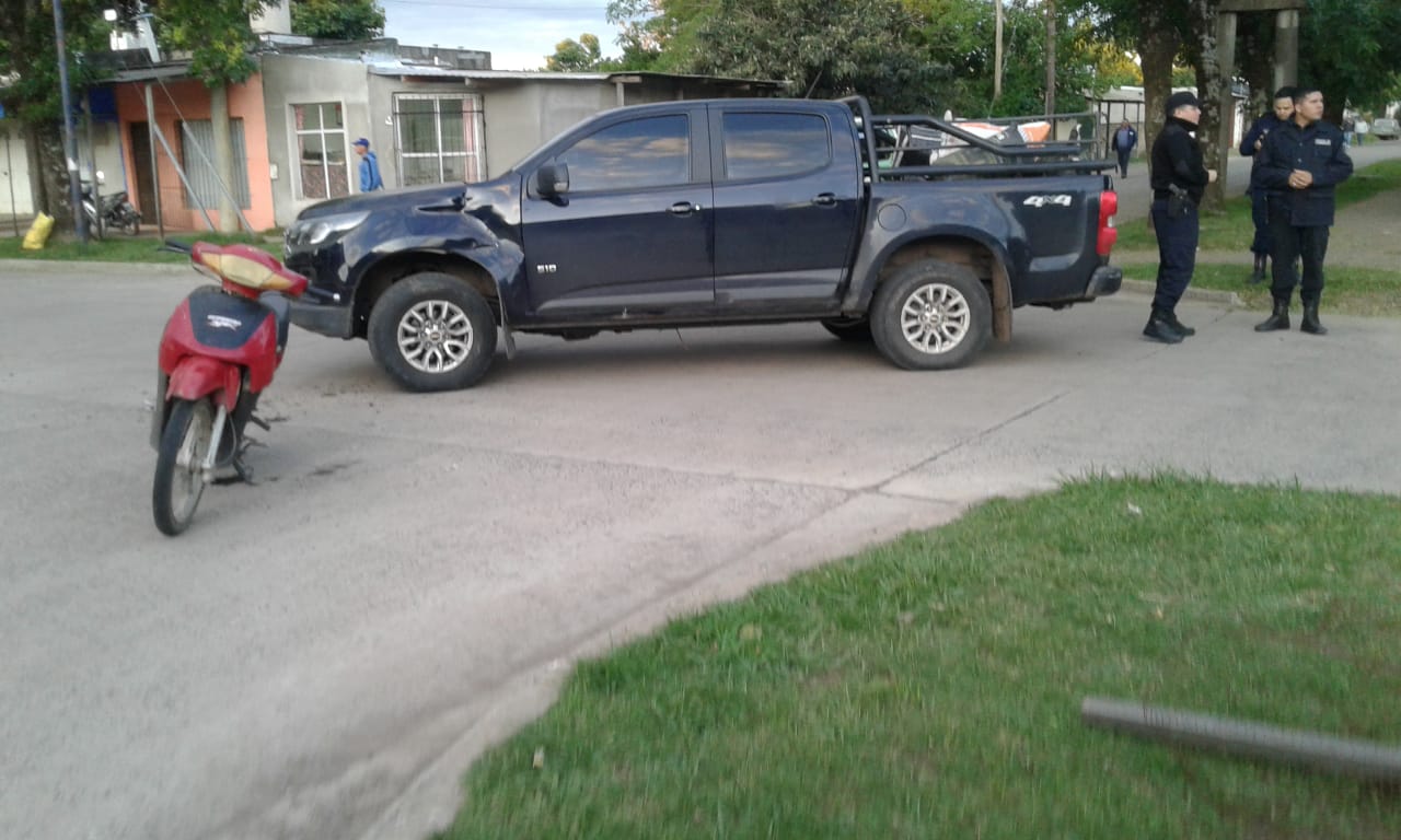 Una moto, guiada por una mujer mayor de edad, y una camioneta, conducida por un masculino mayor de edad, protagonizaron en horas de la tarde del lunes un accidente sobre Avenida Laprida a la altura de su intersección con Castelli, en el lugar trabajaron efectivos de Comisaría Primera e inspectores de la Dirección de Tránsito.