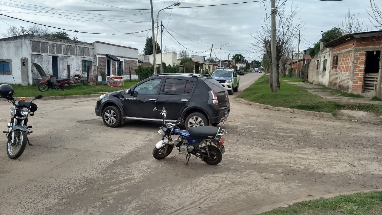 Un automóvil Renault Sandero y una moto de 70 centímetros cúbicos protagonizaron en horas de la mañana del martes un accidente en la intersección de las calles Larrea y Soler, en el Barrio 100 Viviendas de nuestra ciudad.