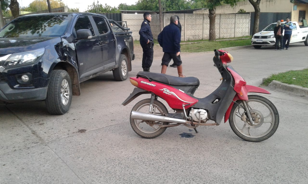 Una moto, guiada por una mujer mayor de edad, y una camioneta, conducida por un masculino mayor de edad, protagonizaron en horas de la tarde del lunes un accidente sobre Avenida Laprida a la altura de su intersección con Castelli, en el lugar trabajaron efectivos de Comisaría Primera e inspectores de la Dirección de Tránsito.