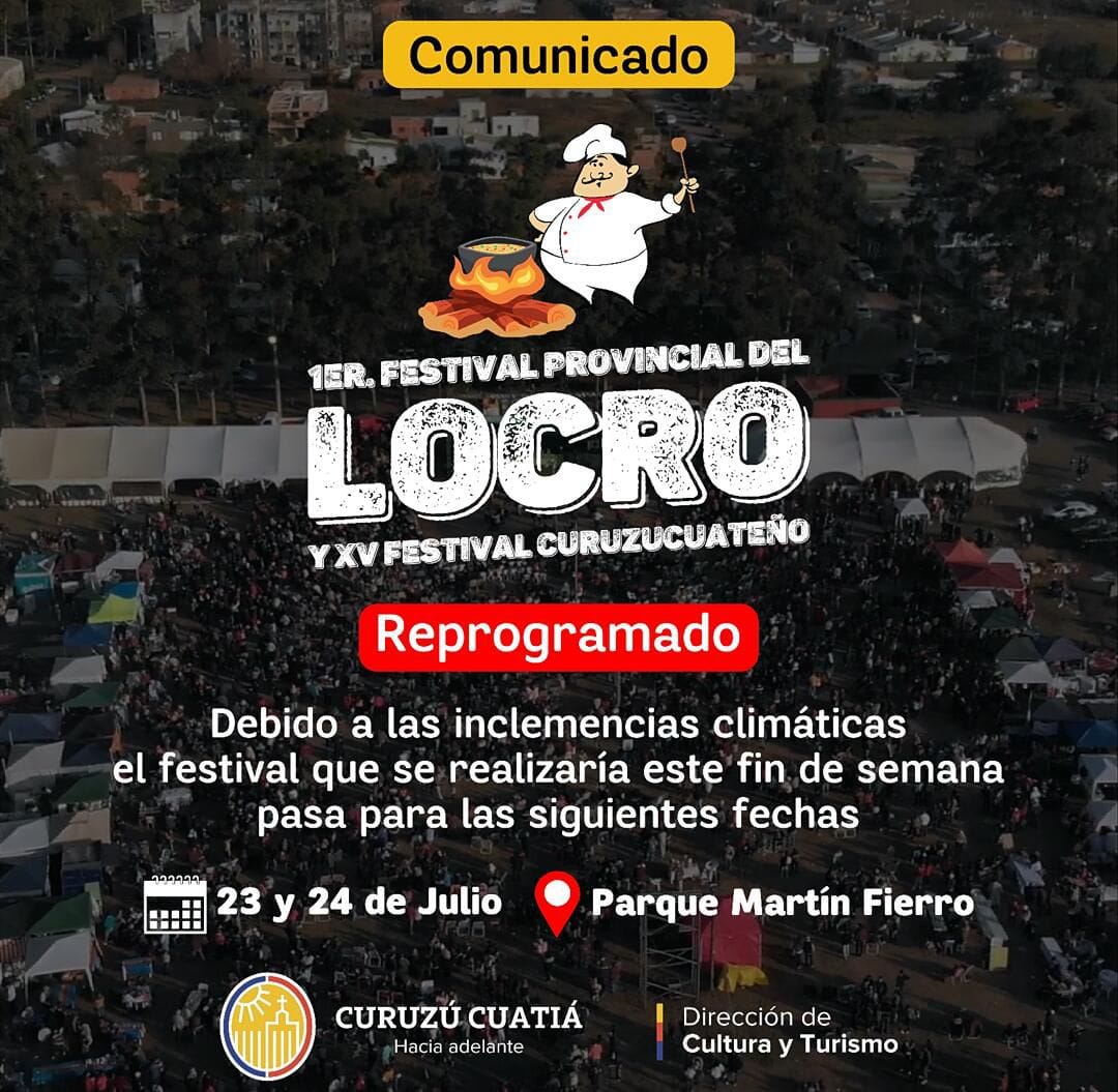 Desde la Dirección de Cultura y Turismo de la Municipalidad de Curuzú Cuatiá informan a toda la comunidad que por inclemencias climáticas se decidió suspender todas las actividades referidas al Festival del locro previstas para éste sábado y domingo.