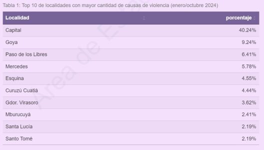 De acuerdo a datos extraídos por Enfoque Digital del sitio oficial del Poder Judicial, la Oficina de Estadística del Poder Judicial de Corrientes elaboró un informe sobre Violencia familiar y de género que corresponde al período enero/octubre 2024 y del mismo se desprende que en los Tribunales de Curuzú Cuatiá se tomaron 162 denuncias.