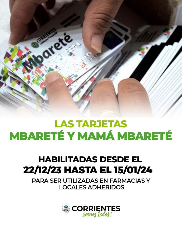 El Gobierno provincial, a través del Ministerio de Salud Pública, a cargo de Ricardo Cardozo, comunica que las tarjetas Mbareté y Mamá Mbareté se encuentran habilitadas desde el 22 de diciembre hasta el 15 de enero de 2024 inclusive, para ser utilizadas por los beneficiarios de las mismas.