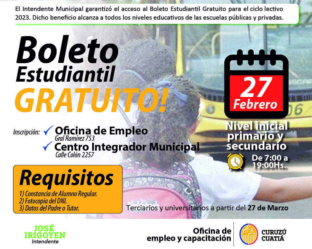 El Intendente José Irigoyen garantizó el acceso a este beneficio, dicho beneficio alcanza a todos los niveles educativos de las escuelas públicas y privadas.