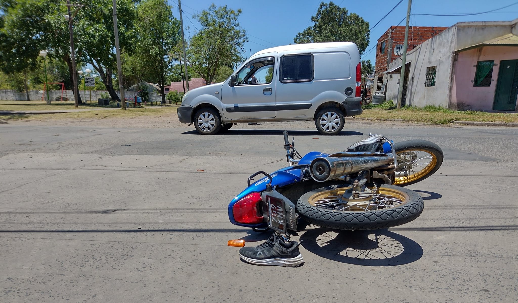 Una Renault Kangoo y una moto de 150 centímetros cúbicos protagonizaron en horas de la mañana del domingo un accidente en la intersección de calle Sarmiento con Larrea de nuestra ciudad, por cuestiones de jurisdicción intervino Comisaría Primera e Inspectores de la Dirección de Tránsito que labraron las actas correspondientes.