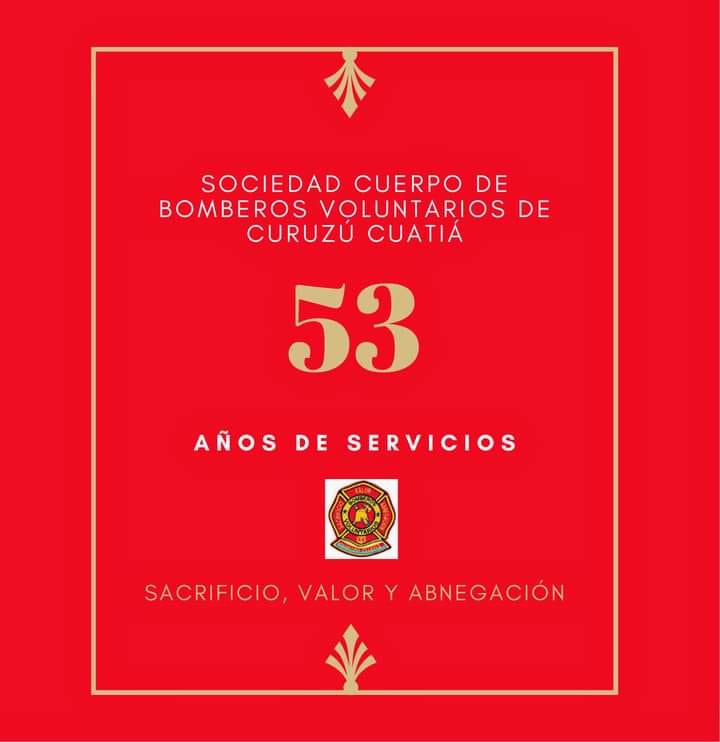 La Sociedad Cuerpo de Bomberos Voluntarios de Curuzú Cuatiá celebra su quincuagésimo tercer aniversario de vida con alegría, en un marco de estabilidad y de crecimiento institucional y con grandes desafíos por delante con el afán de servir a la comunidad sin condiciones.