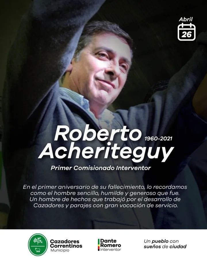A un año del fallecimiento de Roberto Acheriteguy la comuna a cargo de Dante Romero realizó una emotiva publicación en su cuenta de Facebook.