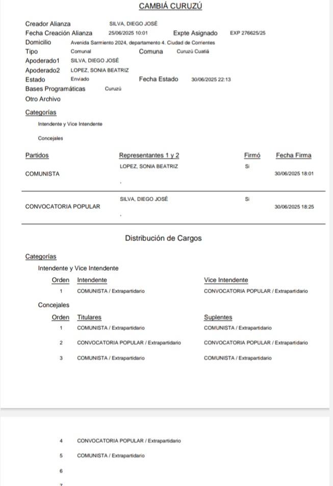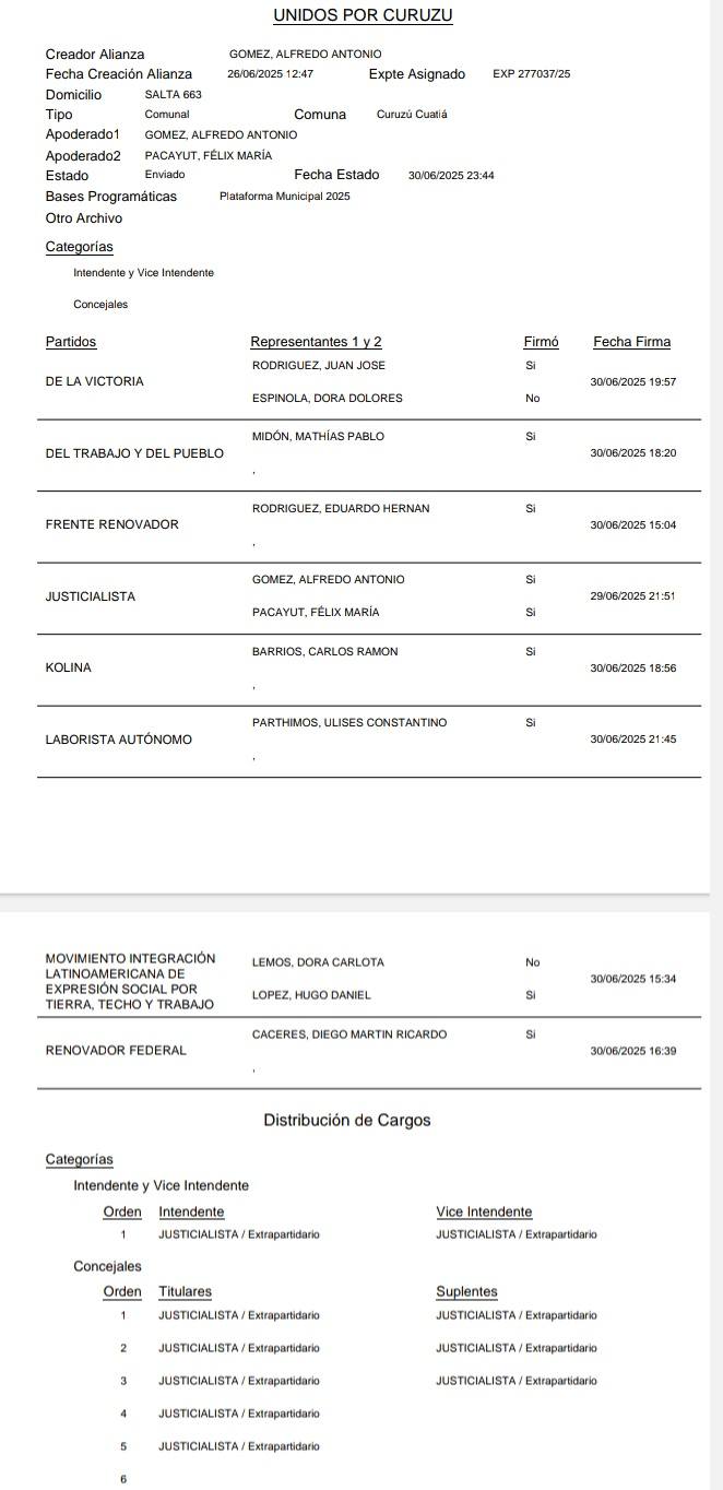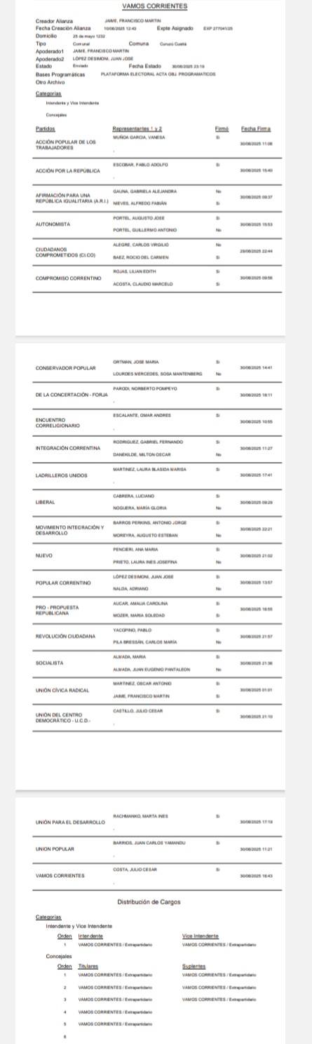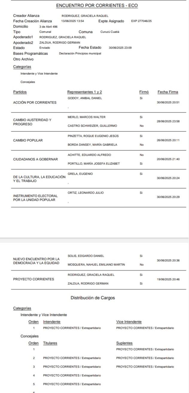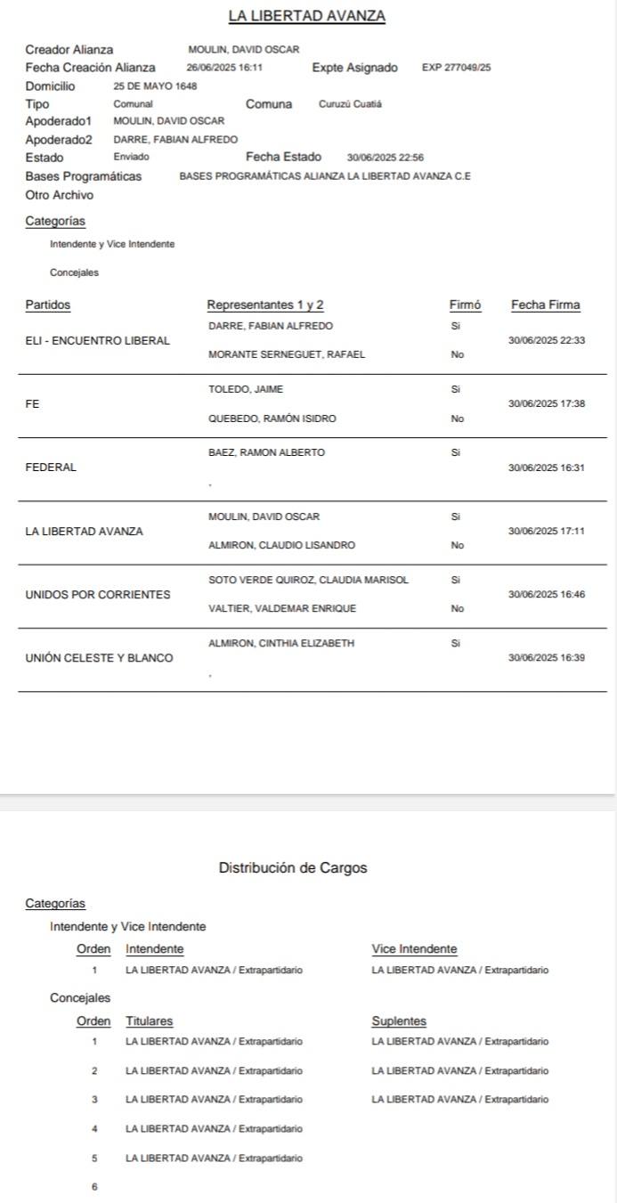 Las cinco alianzas anotadas son: Vamos Corrientes – Unidos por Curuzú - La Libertad Avanza - Encuentro por Corrientes – Cambiá Curuzú.
