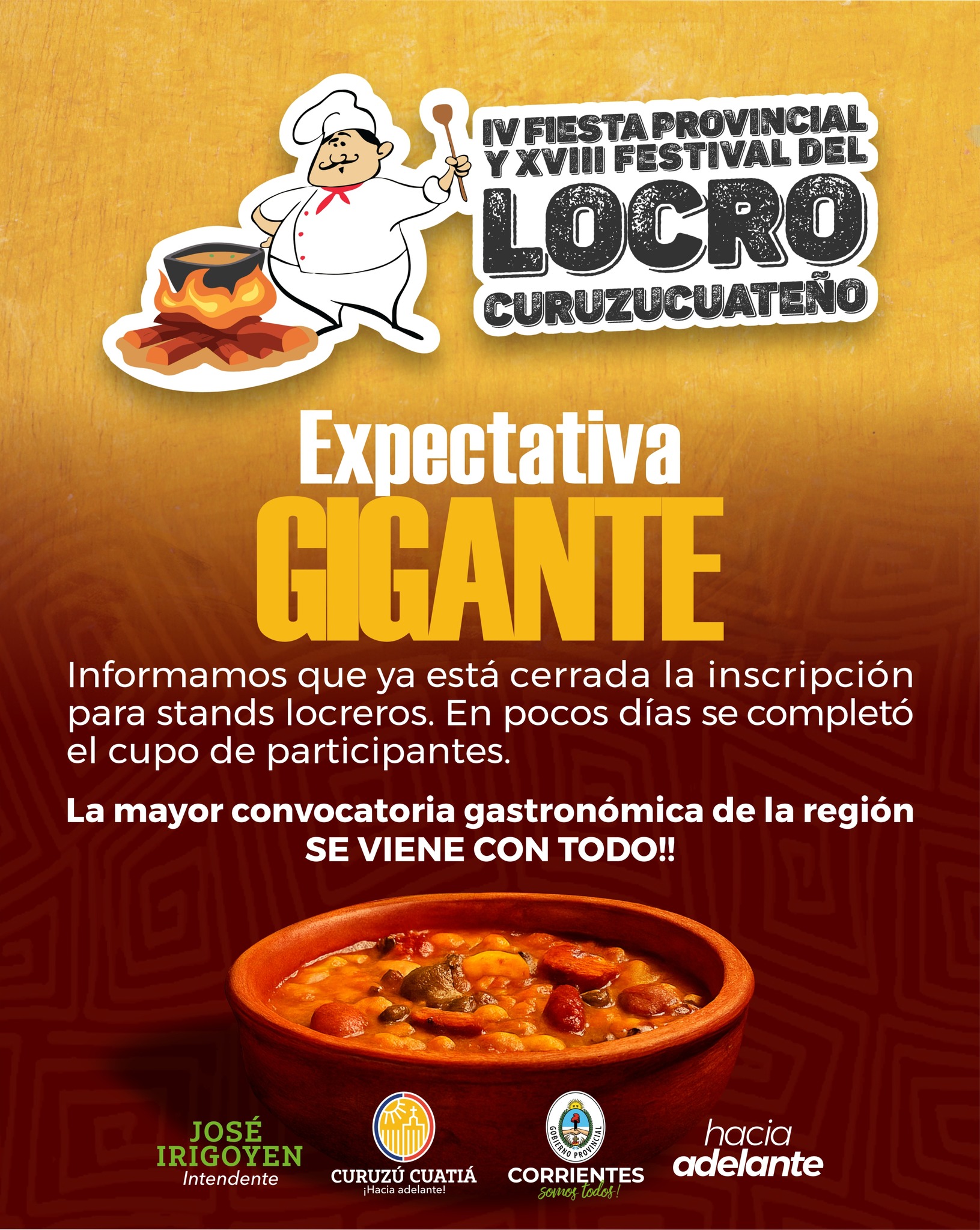 La Dirección de Cultura y Turismo de la Municipalidad de Curuzú Cuatiá informo que se encuentra cerrada la inscripción para el Festival del Locro Curuzucuateño 2025.